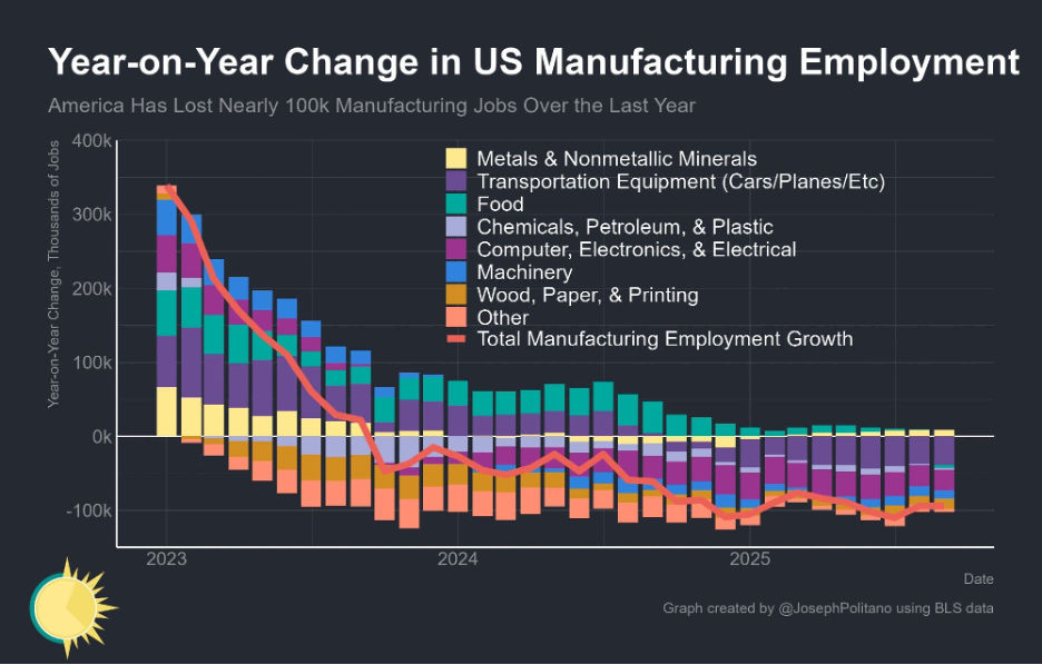 Of course, it takes time to rebuild a whole supply chain, but there are signs that this is not working. In the year since Donald Trump’s election, almost all the manufacturing sectors have been losing jobs, 94,000 in total. For context, 800,000 were added during the Biden administration, compared to 2,5 million in healthcare. The manufacturing sector has been contracting for nine consecutive months, mostly due to the higher import costs companies are facing, as we discussed. This could eventually change as industries move production facilities to the US, but it remains to be seen whether reshoring can be cost-competitive or would permanently impose higher costs on American society. After all, companies have facilities in foreign countries because that allows them to maintain lower operational costs.