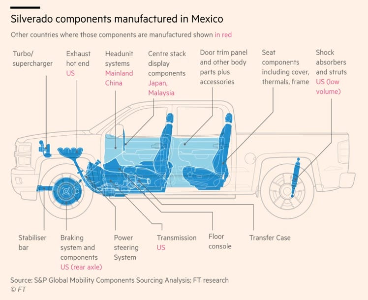 Did the US win the deals? In economic terms, probably not. Many components of American-made cars are sourced internationally. The Financial Times ran a story about the supply chain of the most favoured pick-up truck, the Chevrolet Silverado, showing the countries where key components are manufactured, all hit by high tariffs.