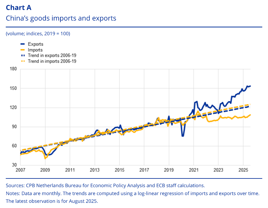 Moreover, Chinese exports are surging almost everywhere. Chinese exports have been growing 10% yearly, compared to 3% globally, and the trend has continued in 2025 so far. Because this seems to be related to weak domestic demand in China, as found in an ECB report, it’s likely not going to change anytime soon, while the same report also recognises that “escalating trade tensions between the United States and China might result in a further diversion of Chinese exports to Europe.”
