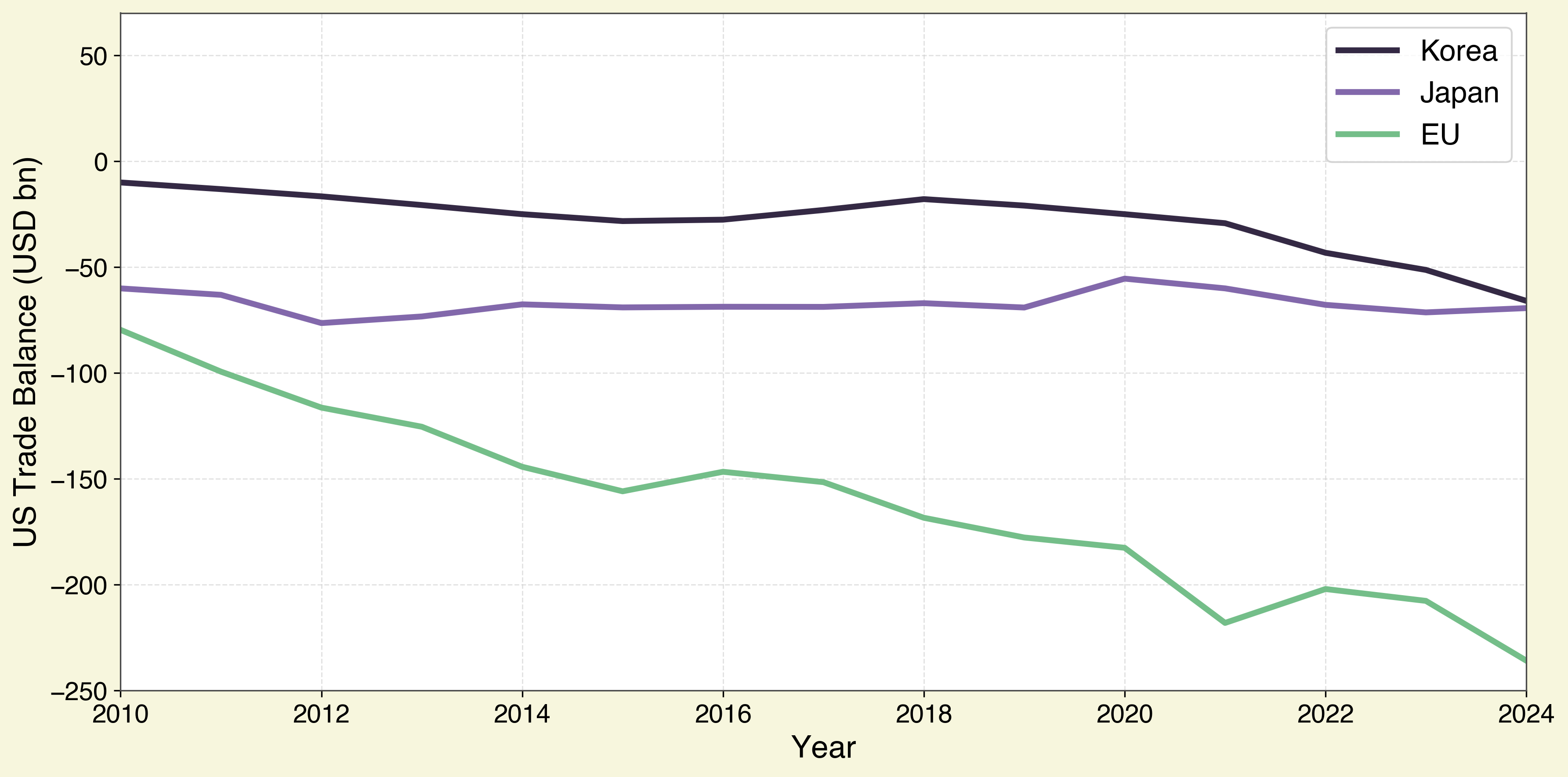 means that net capital inflows correspond to trade deficits, outflows to trade surpluses (see this excellent primer by Paul Krugman for a complete and easy-to-understand explanation). So, the US trade deficit would increase by $450 billion every year until 2028. So, the EU, Japan, and South Korea would still “take advantage” of the United States, hardly a success relative to the original goal of reducing the trade deficit. We must then ask whether reducing the trade deficit is the true objective of these trade wars, or whether it instead masks other underlying motives.